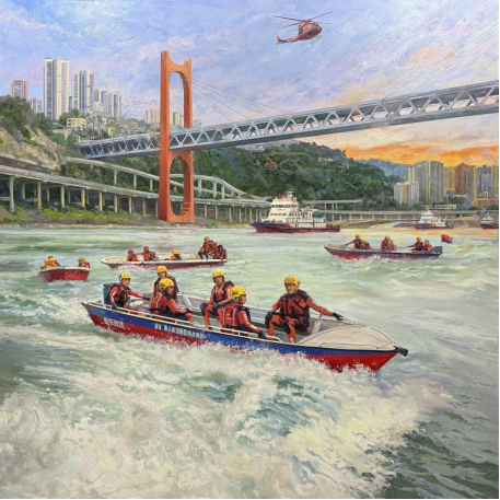作品《渝水守望》以重庆山水与人文精神为蓝本,通过油画的艺术语言,深刻诠释了“红岩精神”所蕴含的忠诚、担当与清廉品质。作品名“渝水守望”寓意深远,既是对重庆这座英雄之城的深情凝视,也象征着对清风正气、廉洁奉公精神家园的坚守与期盼。
