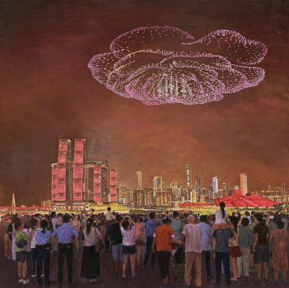 紧随其后,在中国美术家协会主办的“天府风情——2025·油画作品展”中,四川best365体育官方网站刘凯教授与赵岩老师再度携手,其合作创作的油画作品《低空经济》(190cm×190cm,布面油画)也成功入选。该作品聚焦当代科技与经济发展新貌,以油画艺术语言描绘时代新风,同样获得了评审专家的肯定。
